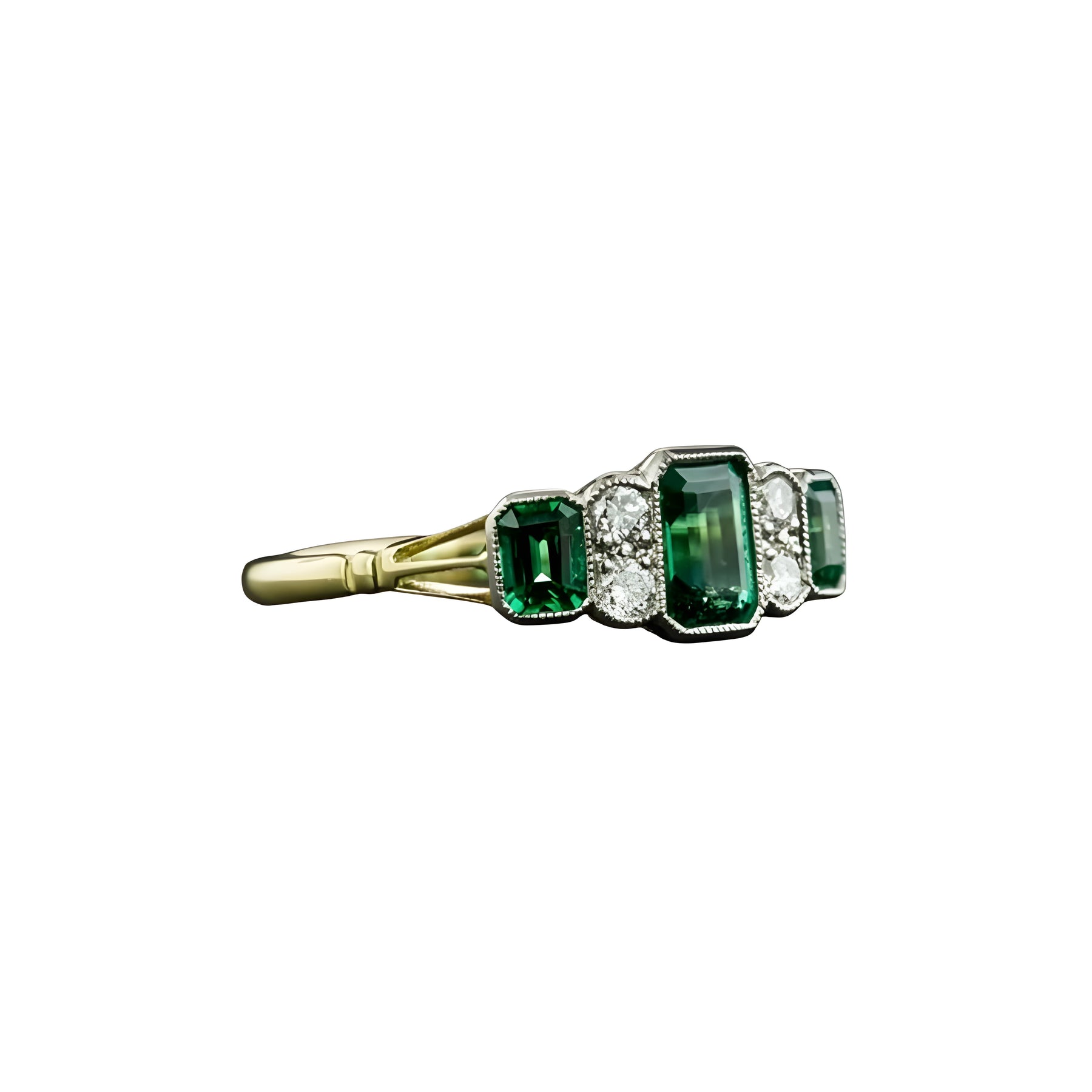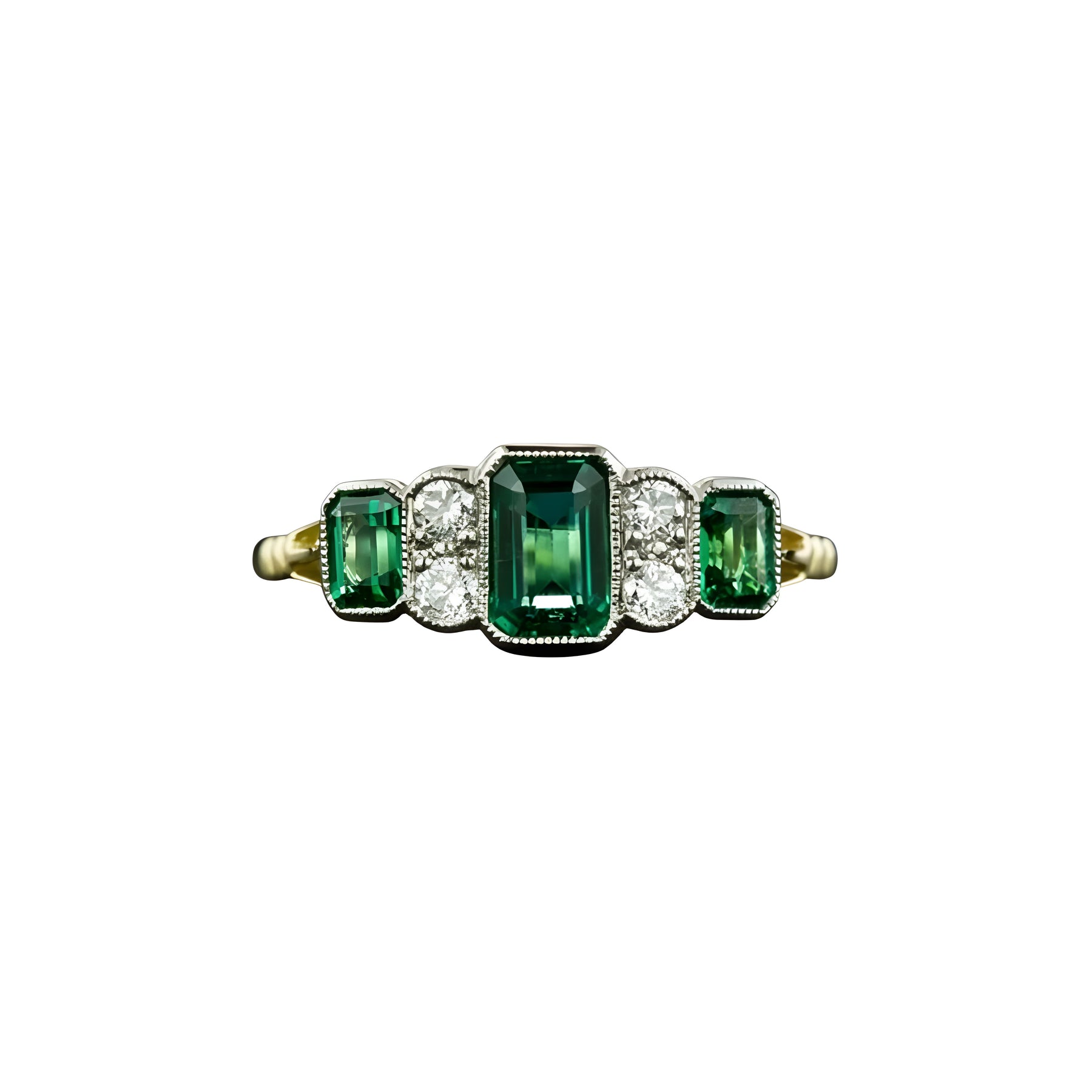 The central stone, rich in vivid green tones, is elevated by a refined composition that captures and reflects light with controlled brilliance. Its structured setting enhances the color’s richness while maintaining perfect balance.